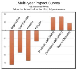 A number of years ago, we conducted an informal study of our weekly hands-on program. Surveys were filled out by 108 LifeSpark participants in-person before the first and before the twelfth sessions. (At that time our program was 3 months long.) Results showed statistically significant improvements in physical and emotional states. Depression, somatization, anxiety, and fatigue decreased while physical well-being, functional well-being, and peace/meaning improved.