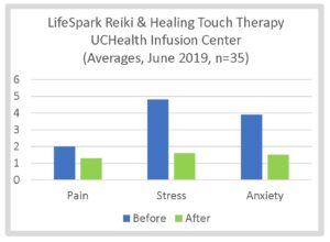 In 2019, the last full year of LifeSpark’s presence at UCHealth Anschutz Cancer Center before COVID-19, we provided 719 sessions in their Infusion Center. Their staff created a before and after self-report survey for patients receiving our therapies. Thirty-five patients participated, and their responses reported that pain dropped by about a third, and stress and anxiety dropped by about two-thirds after just one session.